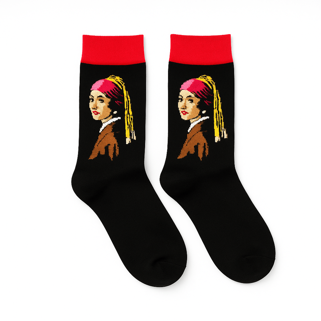 Get the 17th-century feels in this pair of crew socks with Johannes Vermeer's Girl with a Pearl Earring! See its intricate details of a girl with a headscarf and a pearl earring printed in quality fabric.