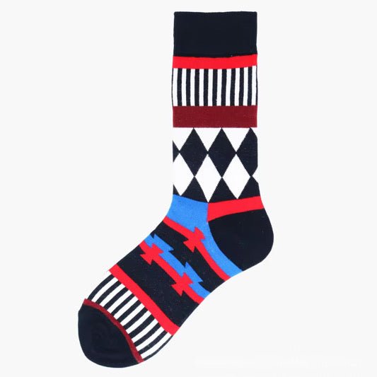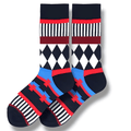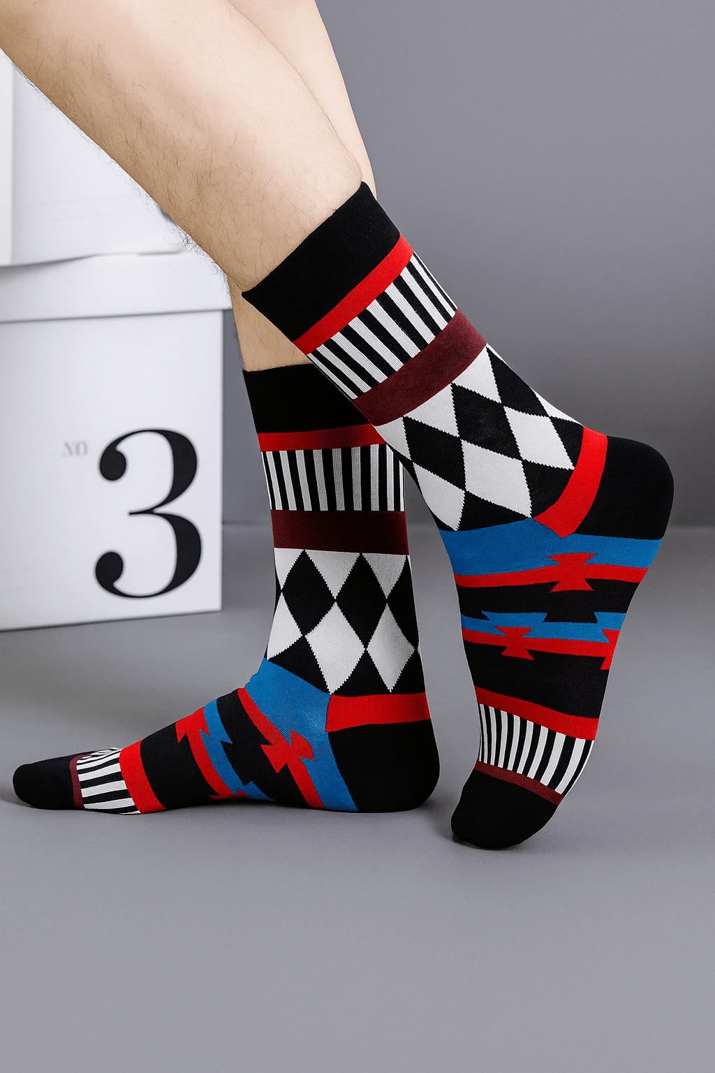 Introducing our stylish pair of socks with a vibrant twist! These socks feature eye-catching geometric designs in a combination of red, blue, and black. They are sure to catch everyone's attention. Made from high-quality materials, these socks are perfect for adding a pop of color to any outfit. Whether you're heading to work or going out with friends, these socks will surely make a statement. Upgrade your socks game with this trendy pair today!